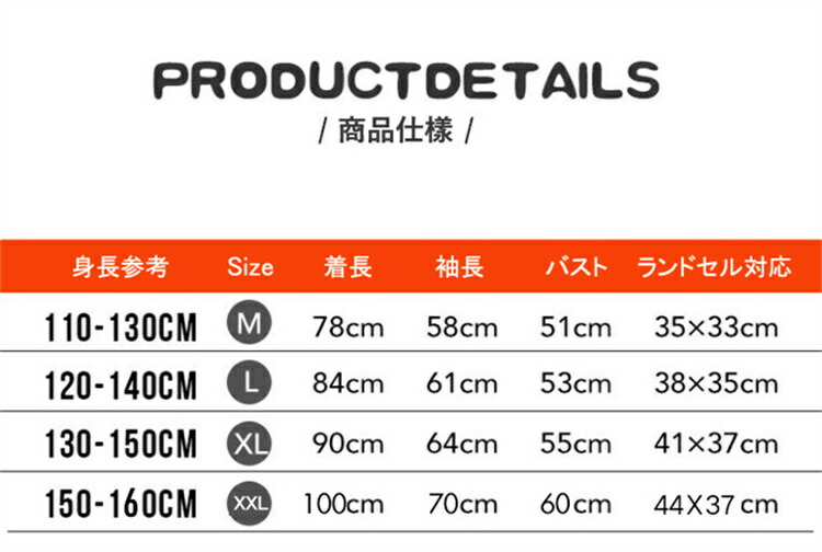 サイズ: M (参考身長:110cm-130cm相当) L (参考身長:120cm-140cm相当) XL (参考身長:130cm-150cm相当) XXL (参考身長:150cm-160cm相当)