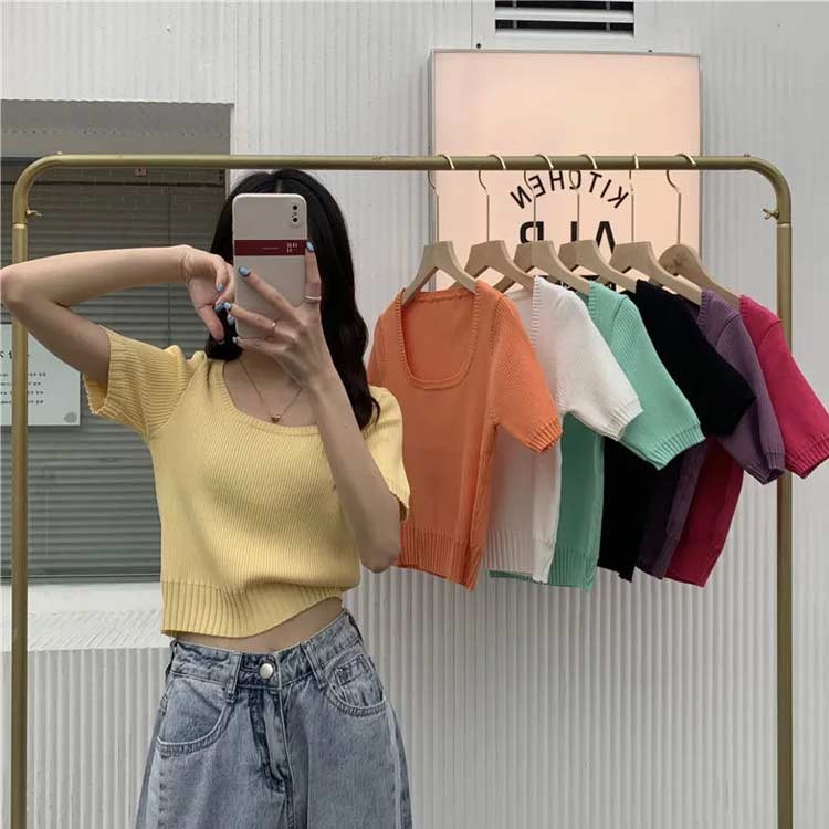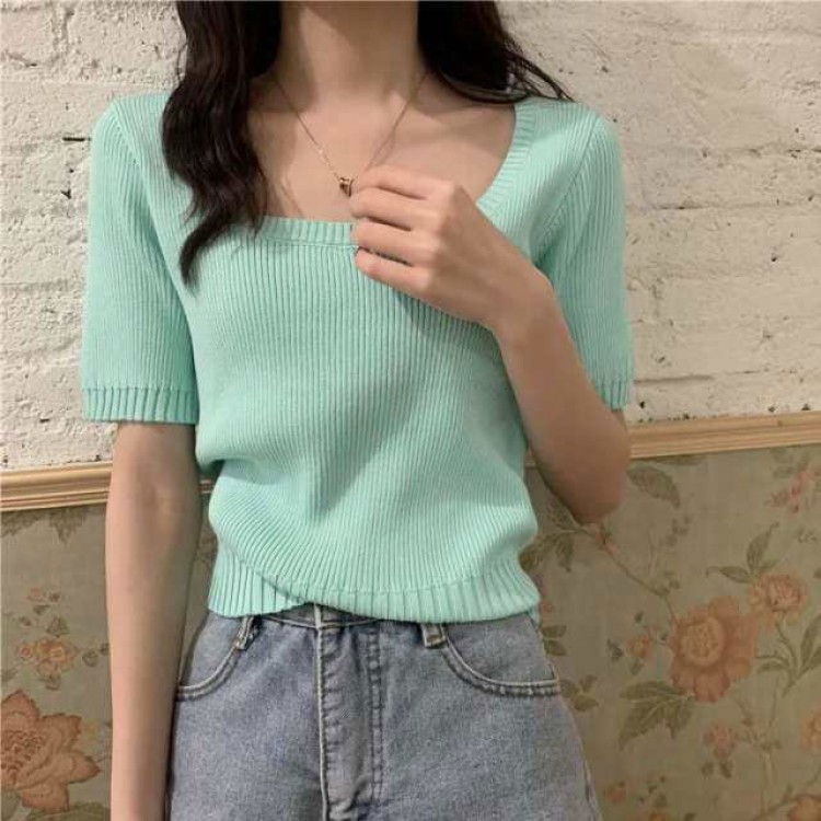 サマーニット レディース リブニット トップス Tシャツ カットソー 人気 ホワイト(角首) ブラック(角首) パープル(角首) グリーン(角首) レッド(角首) イエロー(角首) ホワイト(ラウンドネック) ブラック(ラウンドネック) パープル(ラウンドネック) グリーン(ラウンドネック) レッド(ラウンドネック) イエロー(ラウンドネック) S M L XL