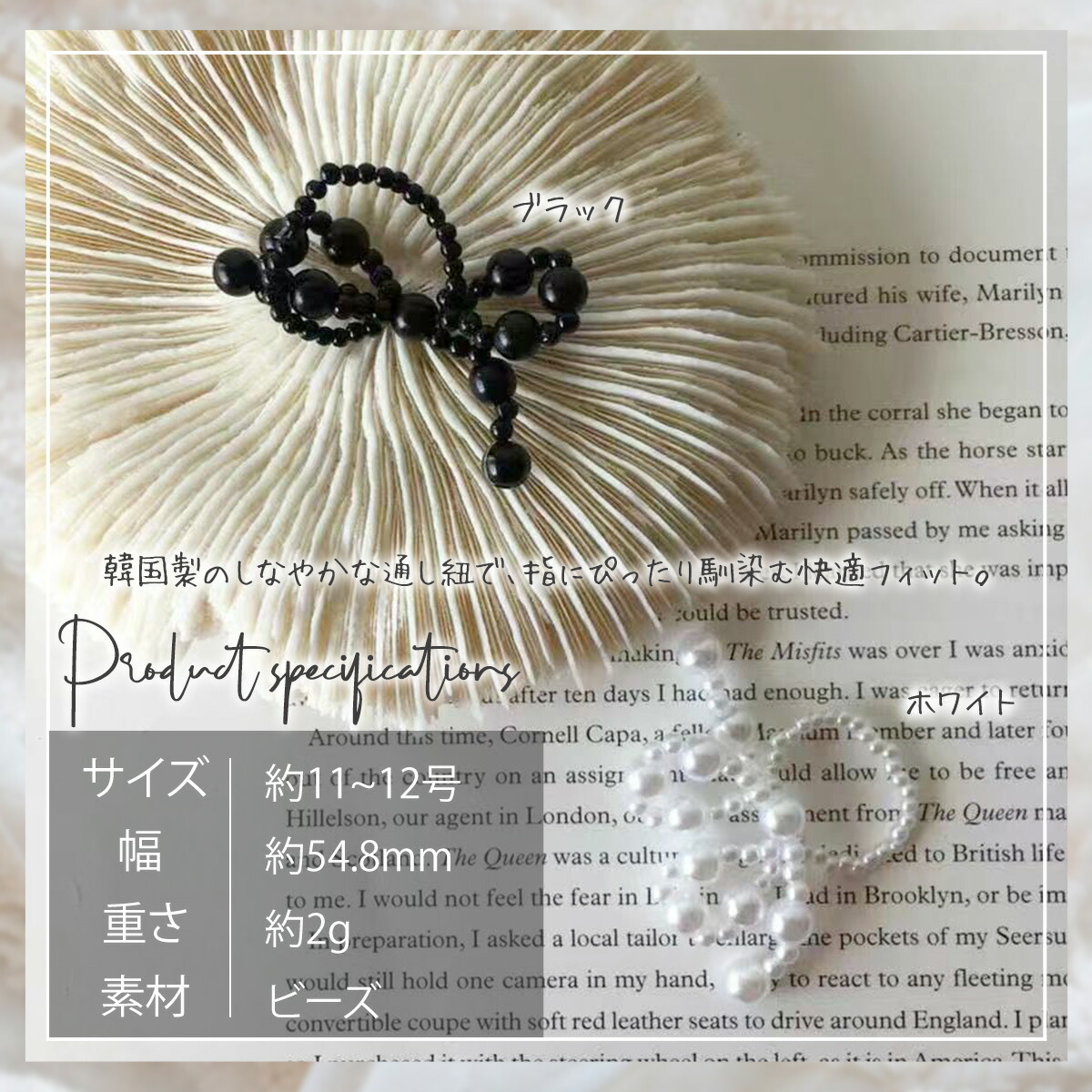 リング部分のサイズ:約11~12号(韓国製のしなやかな通し紐で、指にぴったり馴染む快適フィット。)