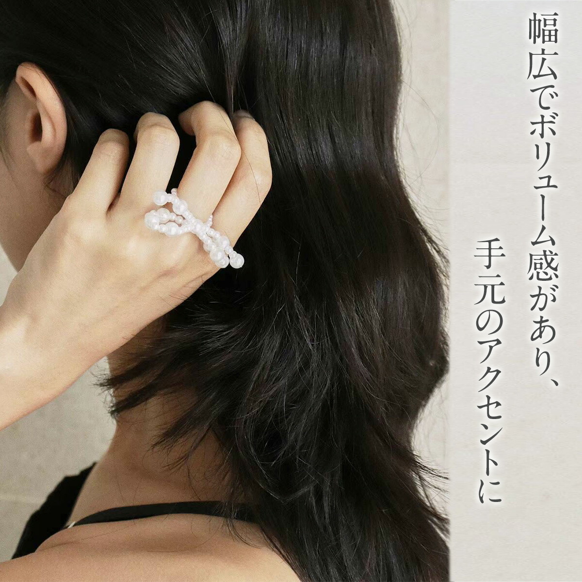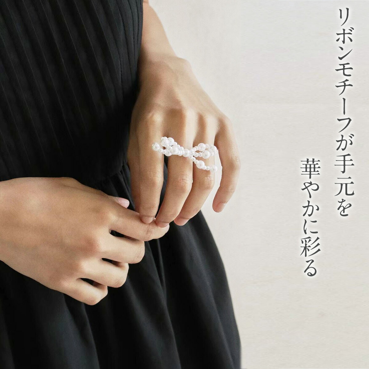 このリボンビーズリングは、シンプルでありながら程よいボリューム感が手元を華やかに飾ります。