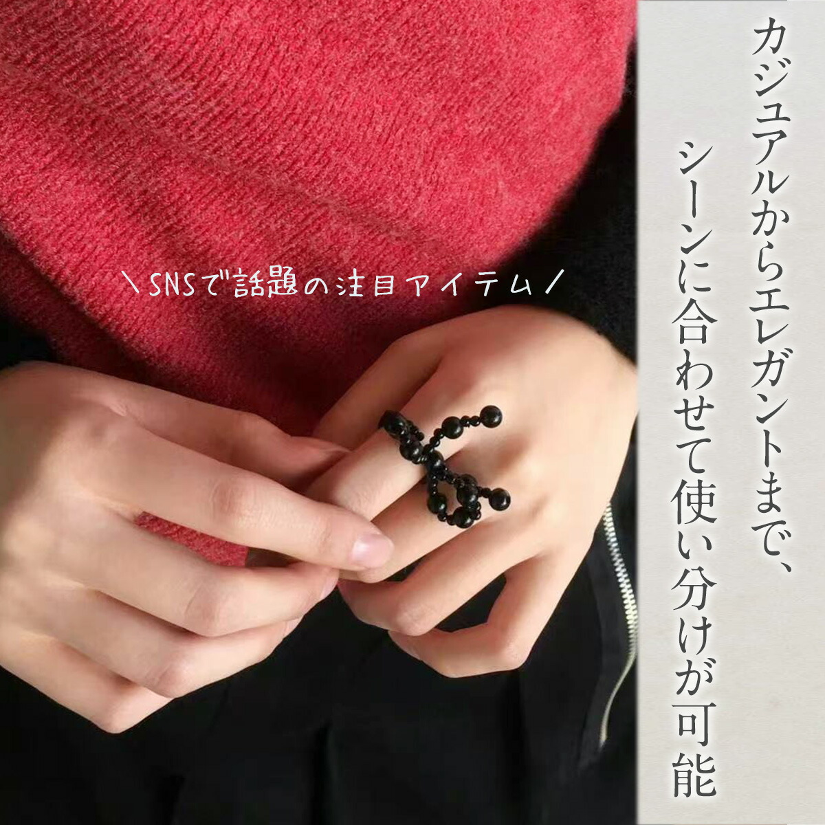 SNSでも話題のこのビーズリングは、ガーリーで可愛らしい印象を与えつつ、大人っぽい落ち着きも感じさせるデザインです。誕生日プレゼントやギフトにも最適です。