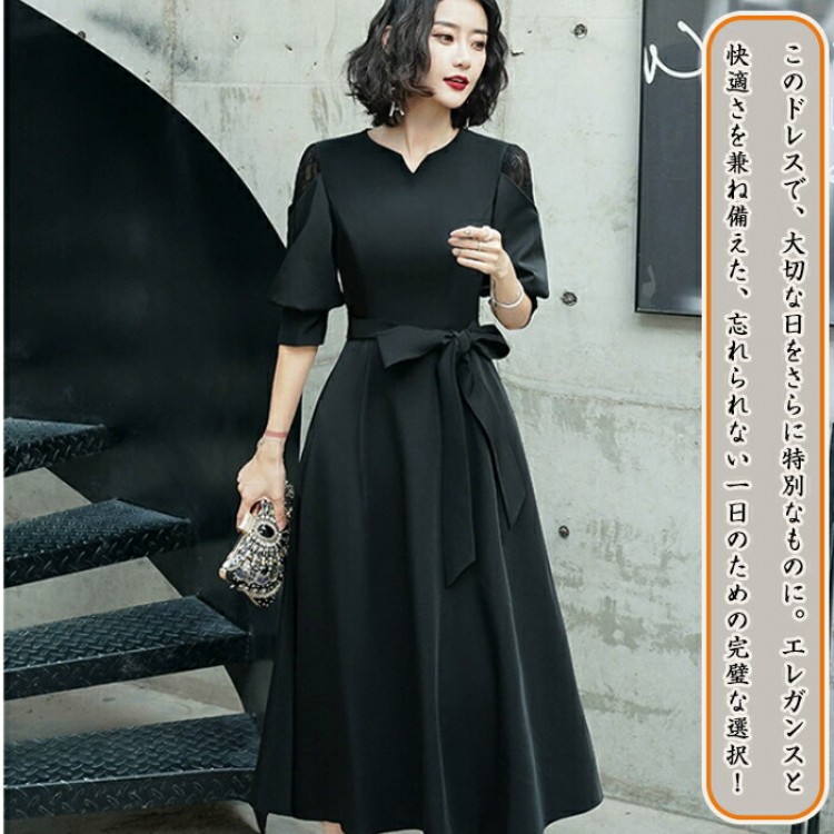 ドレス 大人 ピアノ 発表会 演奏会 ロングドレス 黒 袖あり パーティードレス 着痩せ ワンピース 中学生 高校生 イブニングドレス花柄 Aライン 五分袖 レディース 韓国