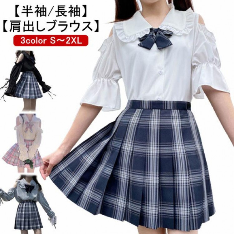 肩出し オフショルダー ビッグカラー トップス シャツ ブラウス 続々登場 ホワイト(半袖) ブラック(半袖) ブルー(半袖) ホワイト(長袖) ブラック(長袖) ブルー(長袖) S M L XL 2XL