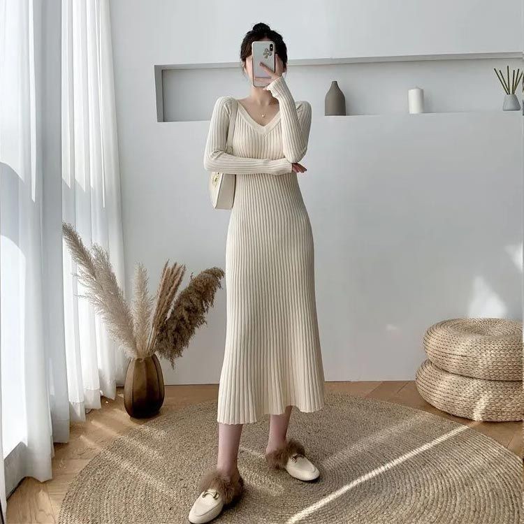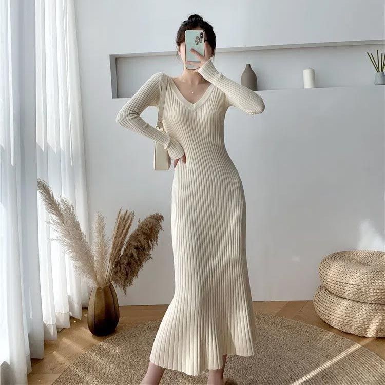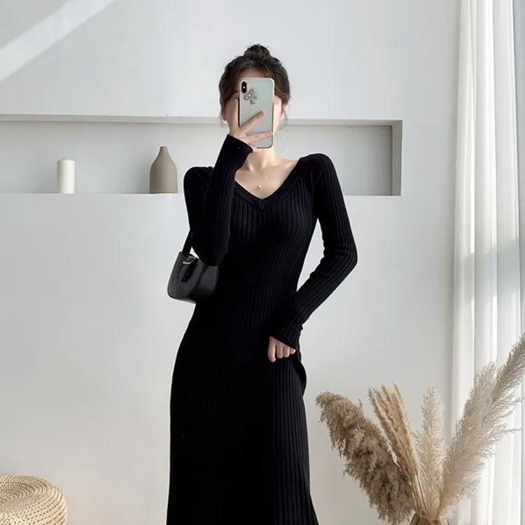 無地 タイトニットワンピース ロング丈 ワンピース 超目玉商品 ブラック ベージュ S M L XL
