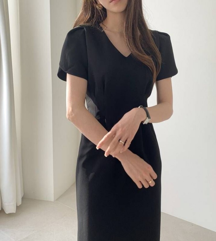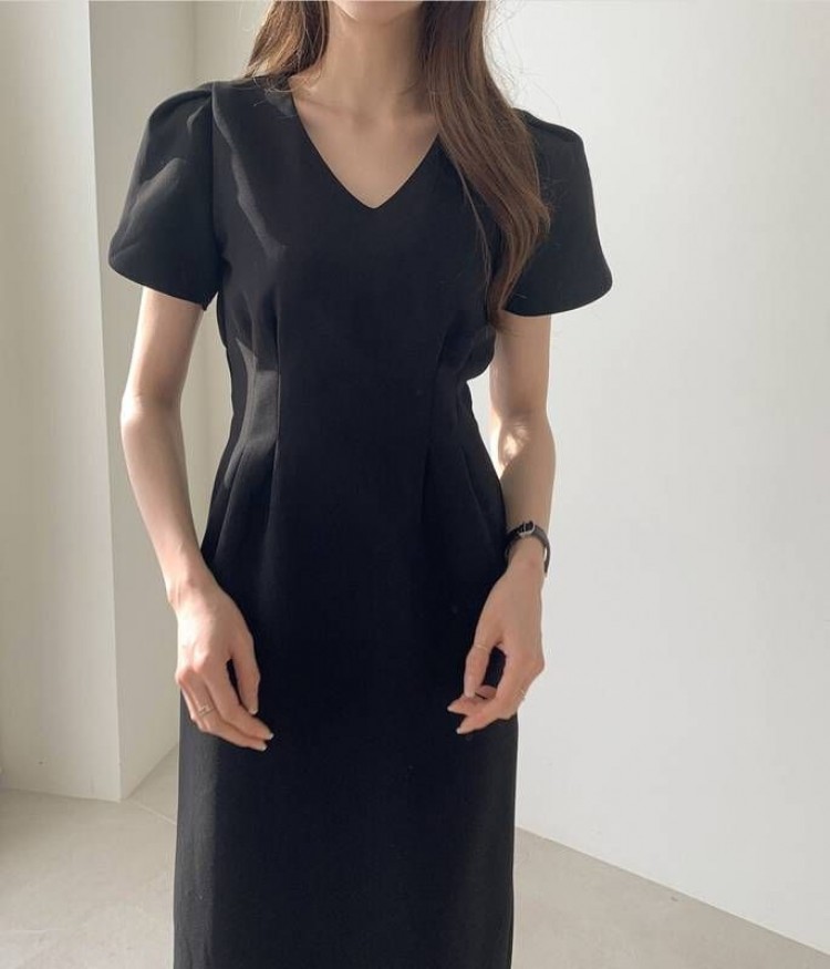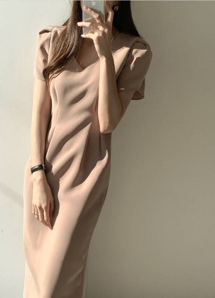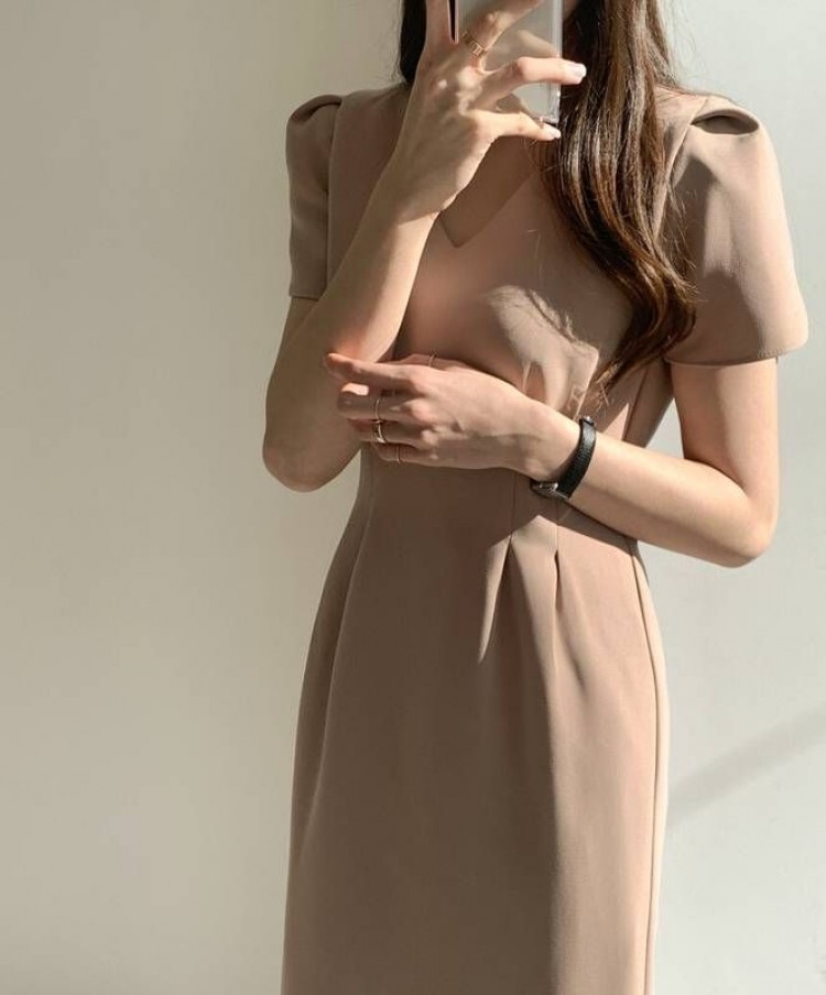 2色展開 エレガント ミモレ 半袖 S ワンピース 続々登場 べージュ ブラック S M L
