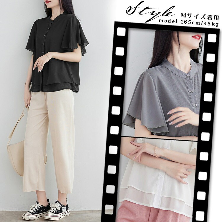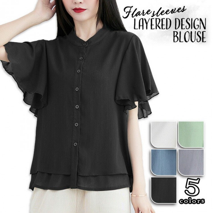 【メール便で送料無料】【レビューを書いて10%OFFクーポンGET】涼し気 薄手 楊柳シフォン フレアスリーブ &レイヤード デザイン スタンドカラー 半袖ブラウス シフォンブラウス 楊柳ブラウス シャツブラウス フリル袖 涼しい 五分袖 春夏 夏 夏用 大人 30代 40代 レディース