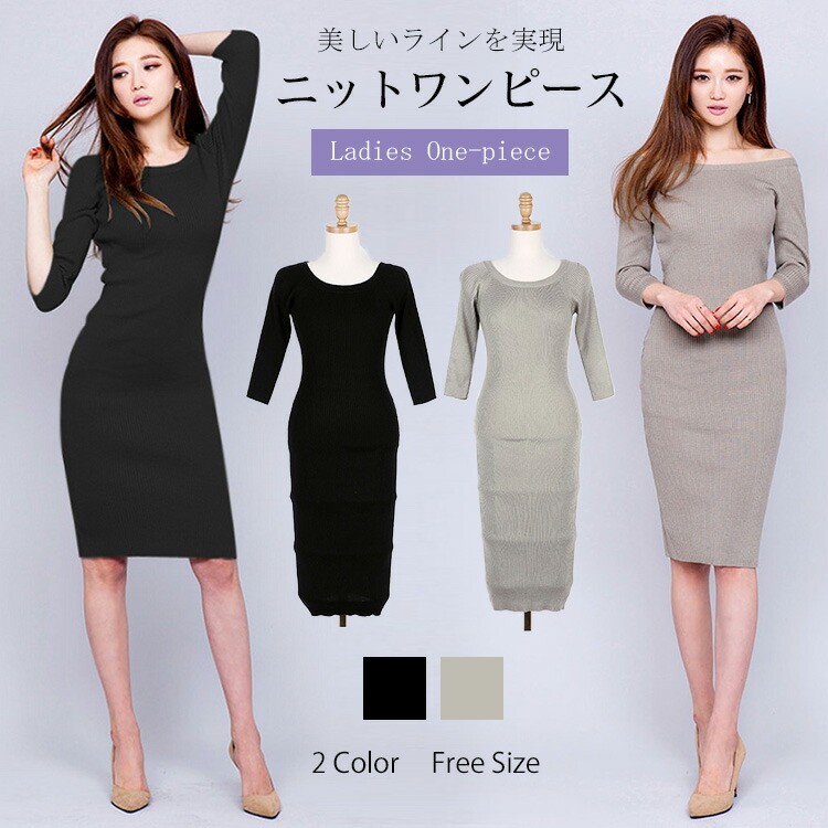 ニットワンピ ニットワンピース タイト 黒 グレー