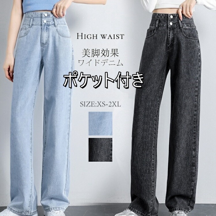 デニム ワイドパンツ 美脚 ストレッチ ブルー九分丈パンツ ブルー長い丈パンツ ブラック九分丈パンツ ブラック長い丈パンツ XS S M L XL XXL