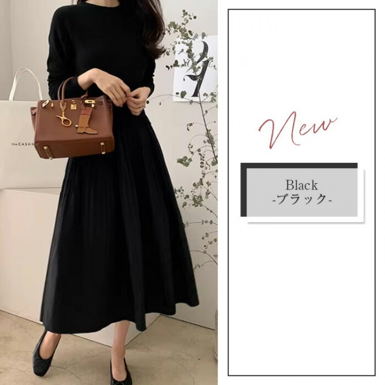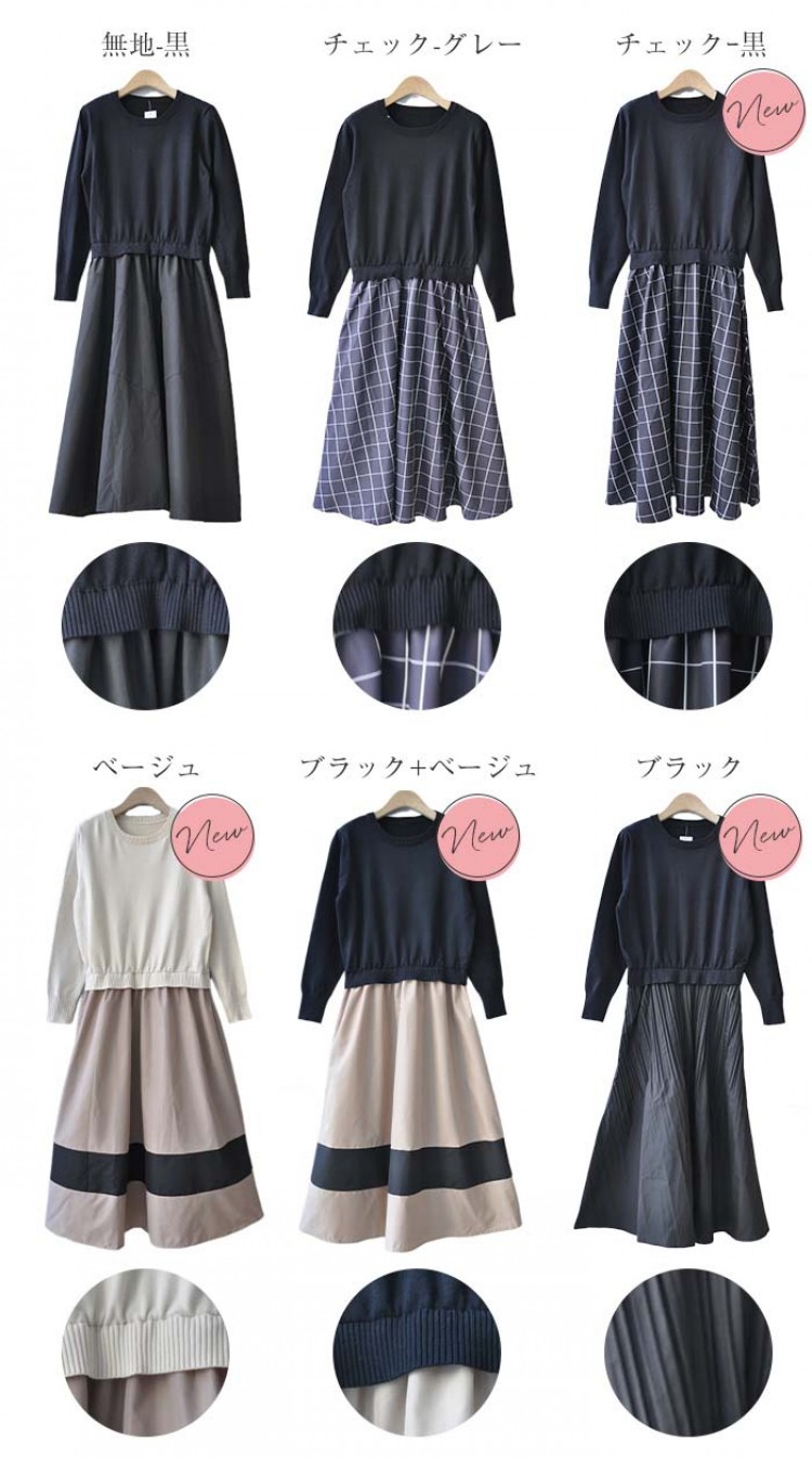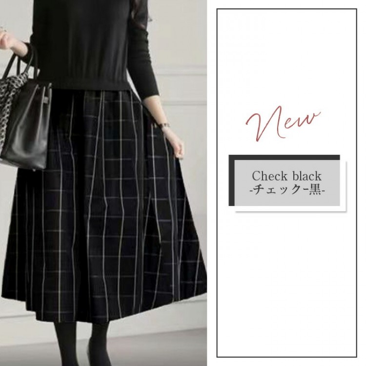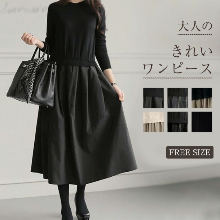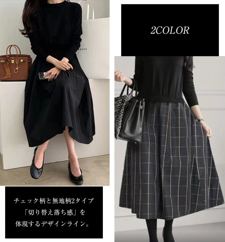 ワンピース きれいめ 秋冬 ロング 春 無地-黒 チェック-グレー (new)ブラック+ベージュ (new)ベージュ (new)チェックー黒 (new)ブラック 【新色】ブラック(ウエスト調整可) 【新色】グレー(ウエスト調整可)