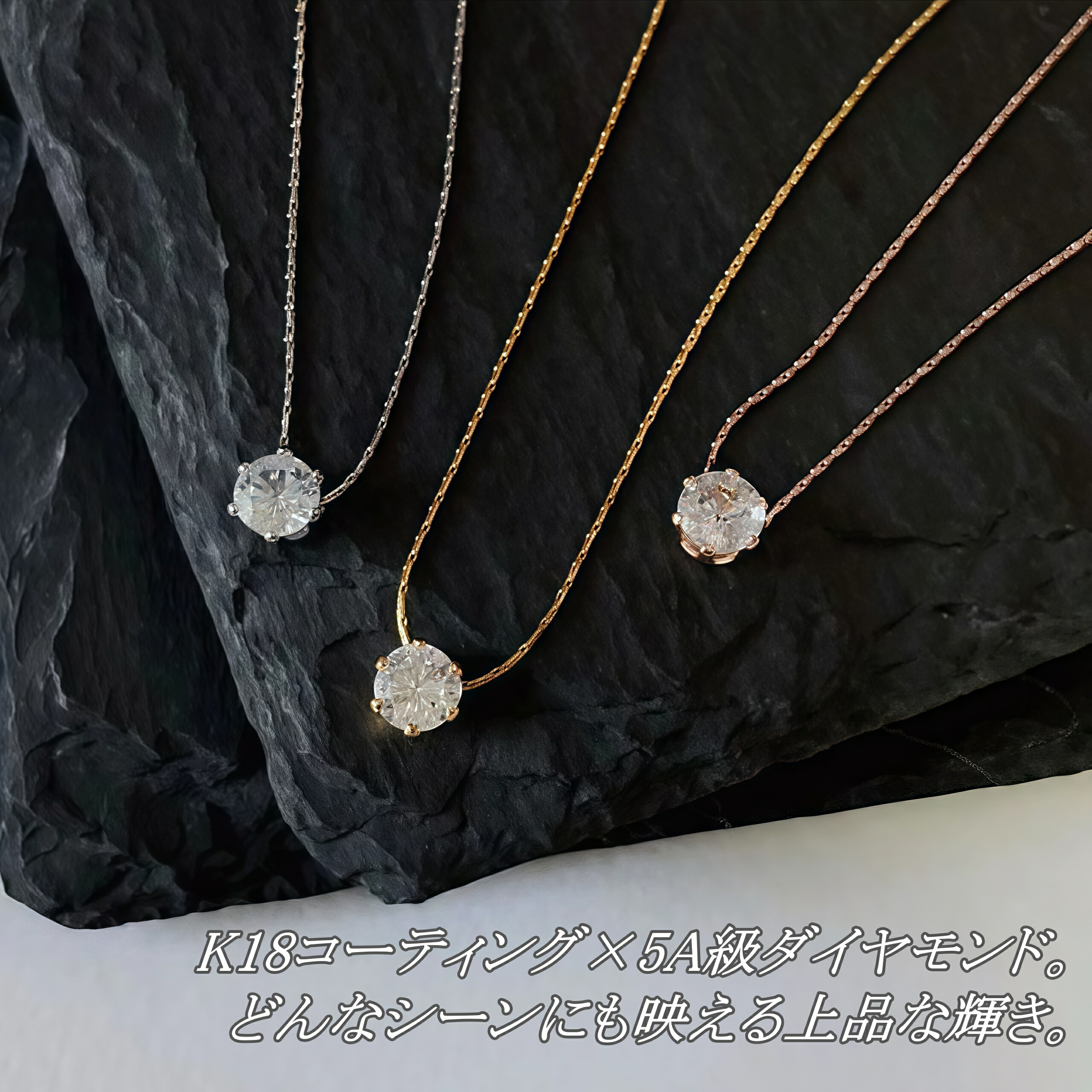 上質なステンレスにK18コーティングを施し、3色(ピンクゴールド、ゴールド、シルバー)からお好きな色を選べます。日常使いに最適なシンプルさを持ちながら、5A級ダイヤモンドの輝きが胸元を華やかに演出。