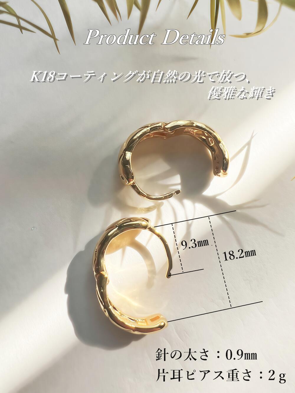 シンプルでありながら、洗練された輝きを放つこのイヤリングは、K18コーティングが施され、どんなシーンでも輝きを持続。自然の光を浴びることで、その上品な輝きがより一層引き立ち、耳元を華やかに演出します。