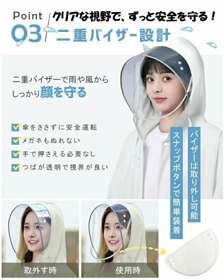 透明なバイザーは取り外し可能で、フードに取り付けることができます。これにより、風や雨、雪からしっかり守りながらも、視界をクリアに保つことができます。斜めからの雨が顔にかかることを防ぎ、風が強くてもフードが飛ばされる心配はありません。フードには調節できるロープが付いており、雨水の侵入を防ぎます。これさえあれば、傘を使わずに自転車やバイクを安全に運転できます。