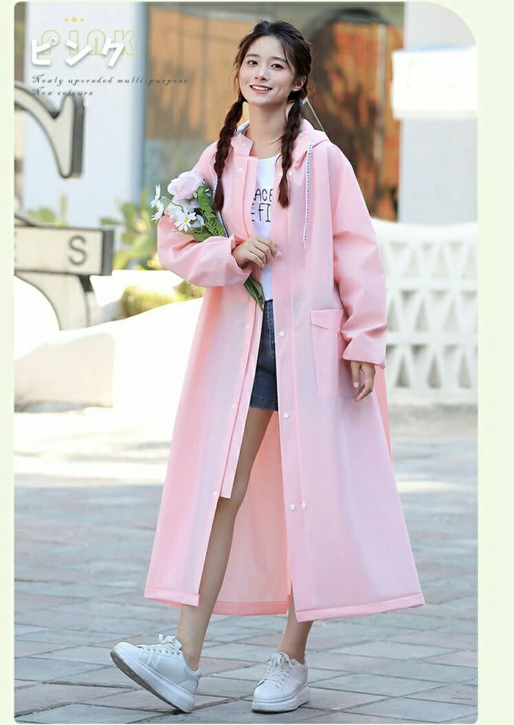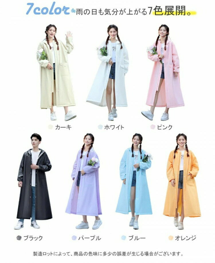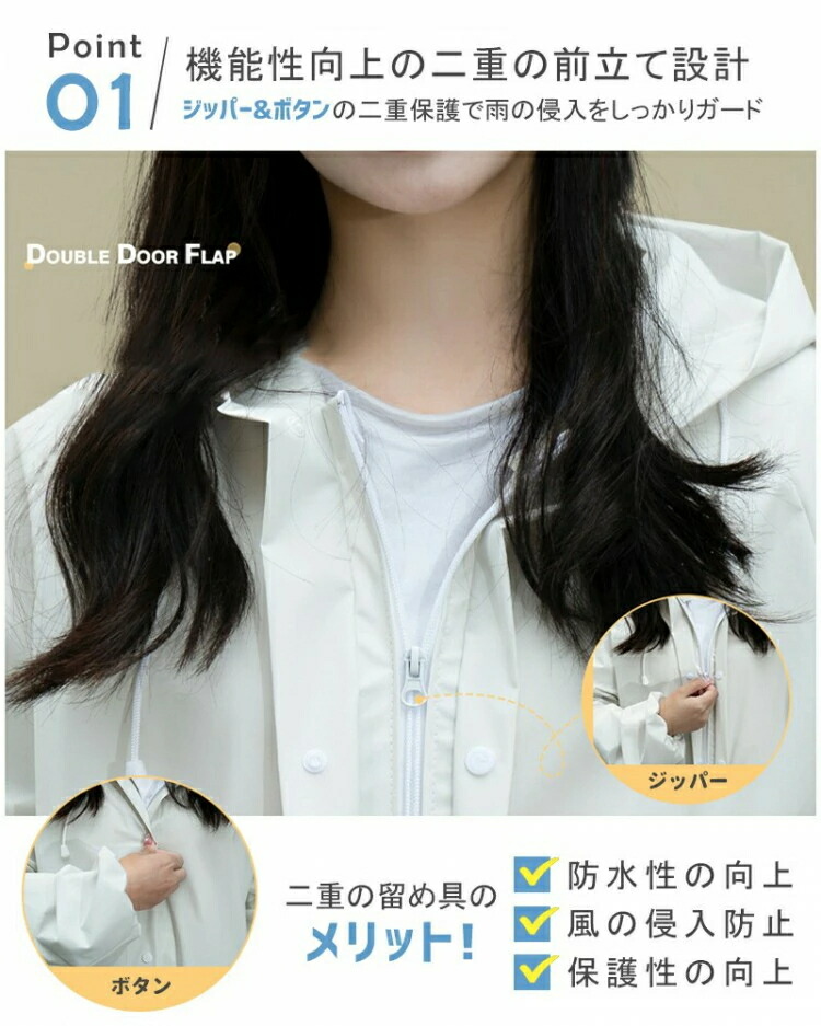 急な悪天候にもすぐに対応できるファスナー&シール式デザインを採用しています。簡単に着脱できるので、急な雨にも安心です。他のレインコートとは異なり、当店のレインコートは高品質のEVA素材を使用しており、長くご愛用いただけます。自転車や原付をお使いの方にもおすすめです。リュックを背負ったままでも楽に着られる、ロング丈のオーバーサイズ設計で、しっかりと体を守ってくれます。