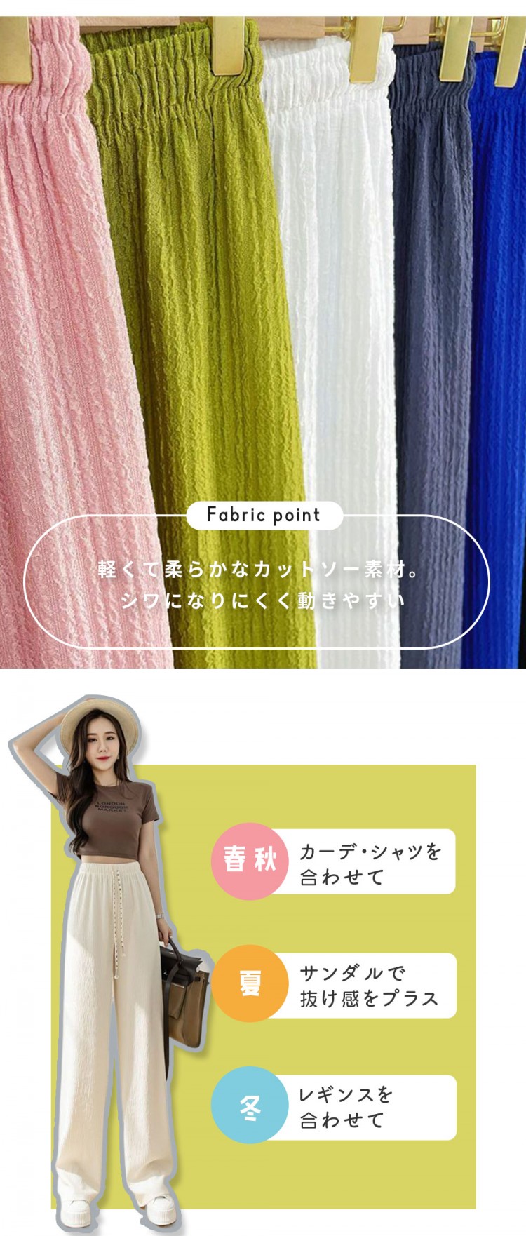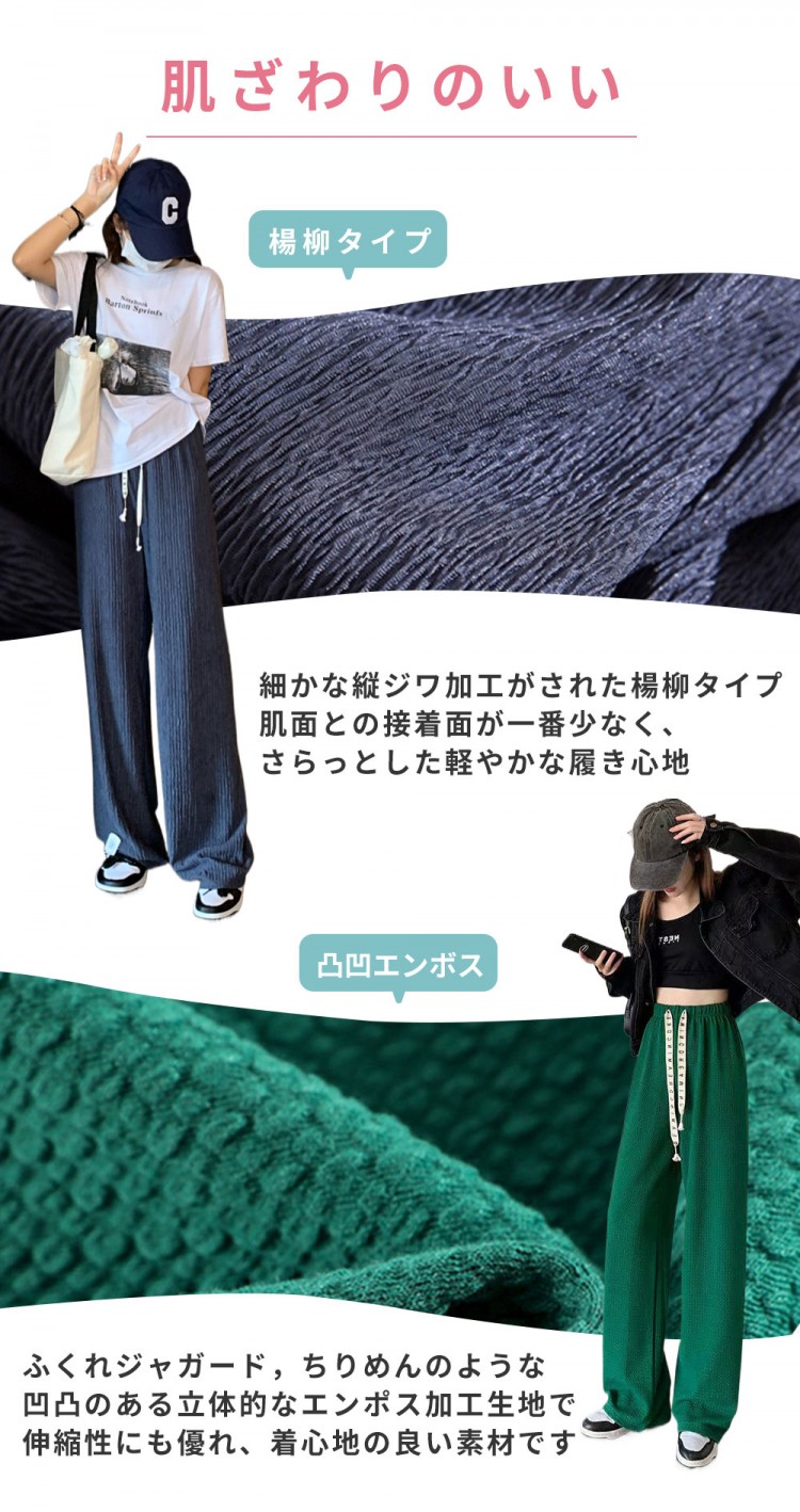 早い者勝ち オフ率50%以上美脚 ワイ ボトムス パンツ 新登場! 楊柳タイプグレー 楊柳タイプブルー 楊柳タイプブラック 楊柳タイプグリーン 楊柳タイプホワイト 楊柳タイプピンク 凹凸エンボスブラック 凹凸エンボスホワイト 凹凸エンボスピンク 凹凸エンボスグリーン