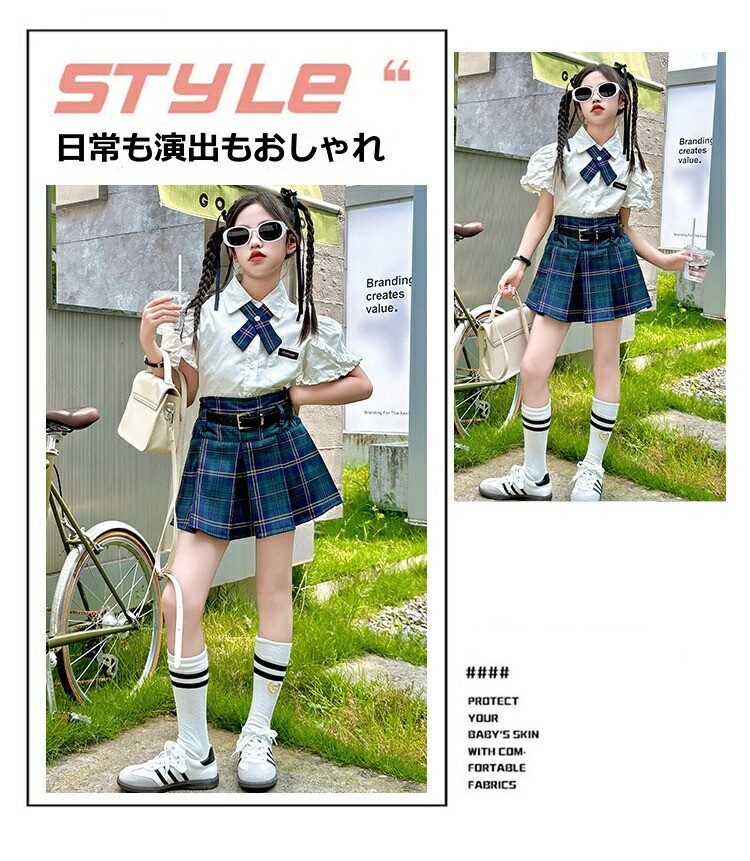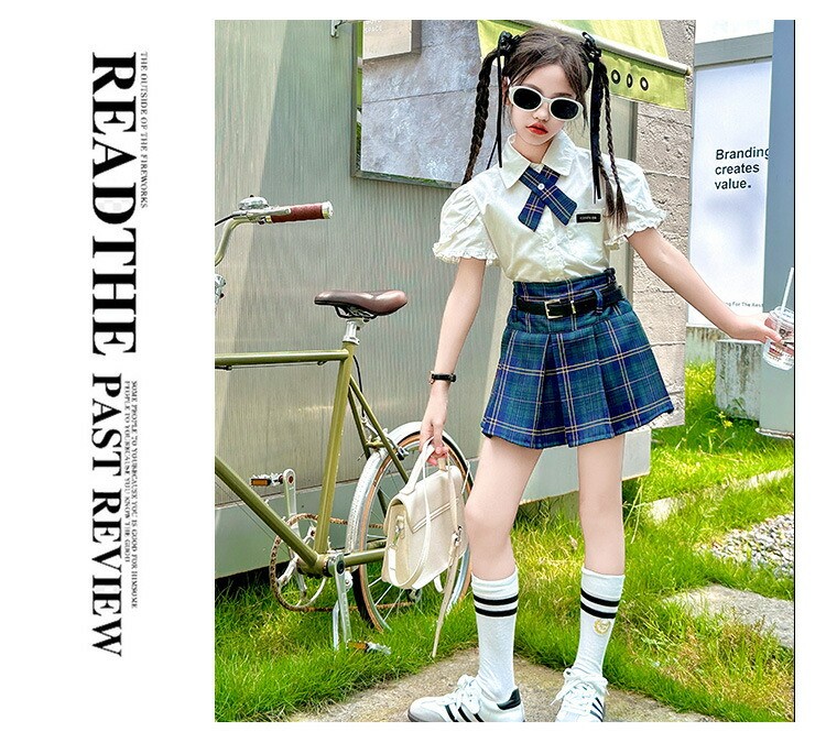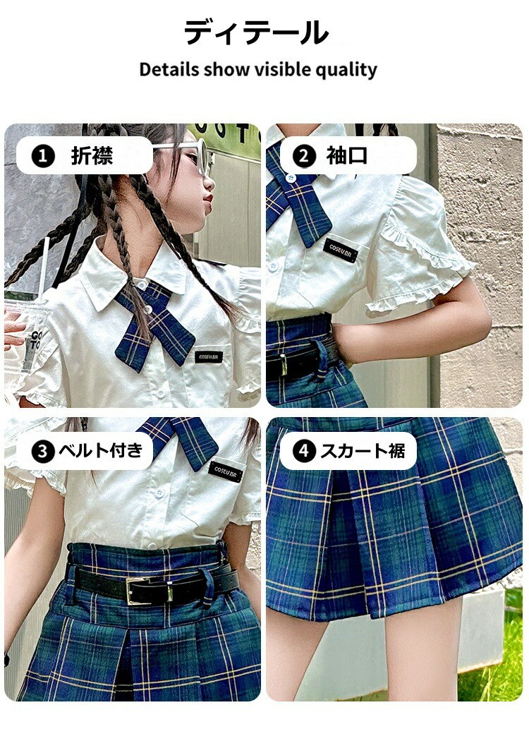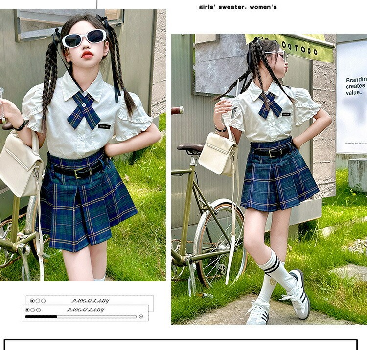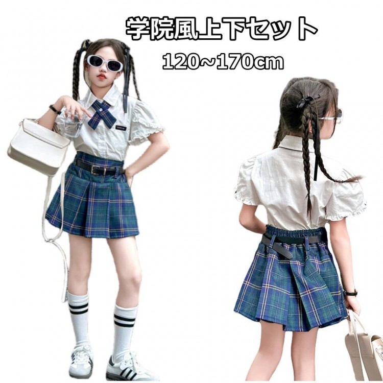 スカートセット 学院風 女の子 小学校 キッズ ドレス 続々入荷中 シャツ+リボン スカート+ベルト 4点セット 120 130 140 150 160 170