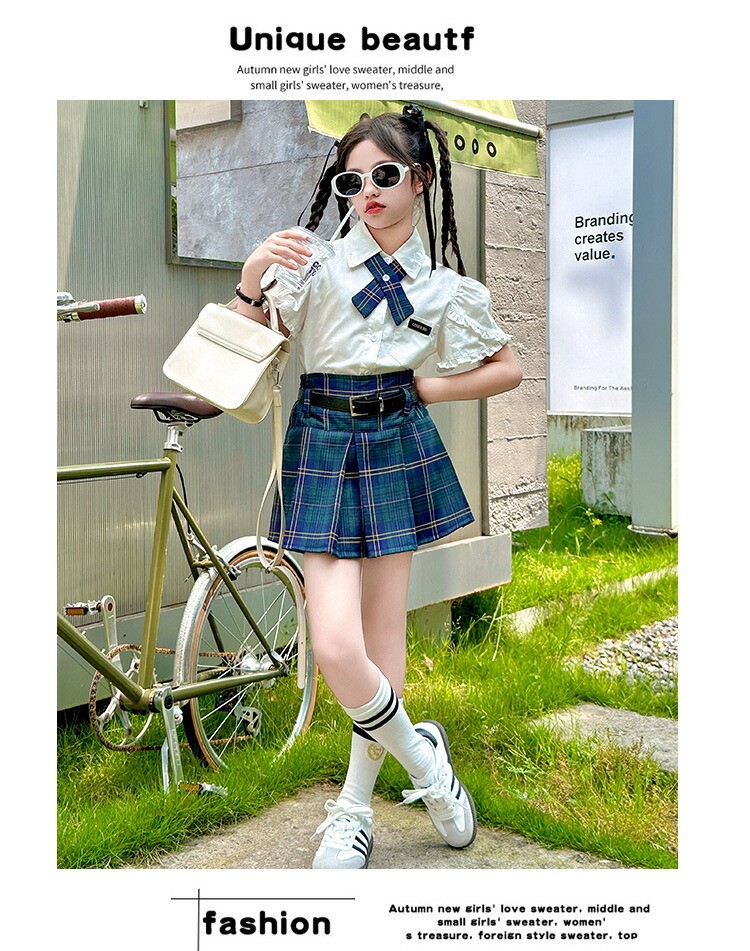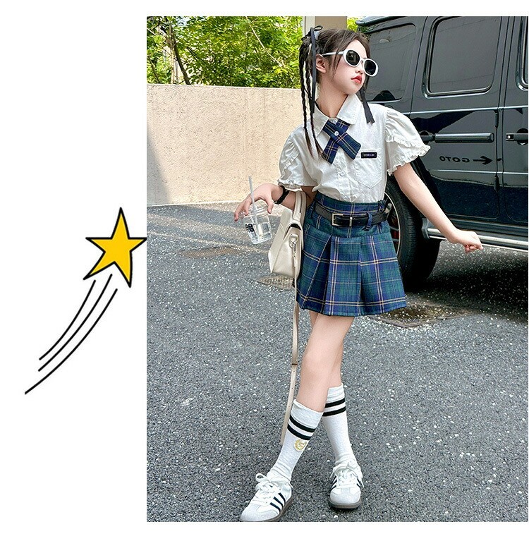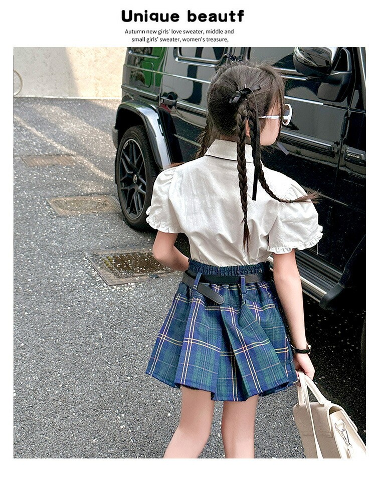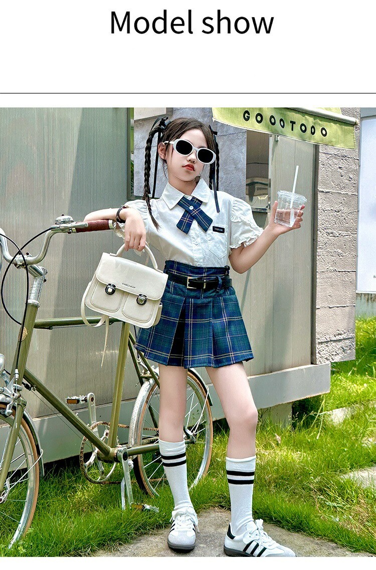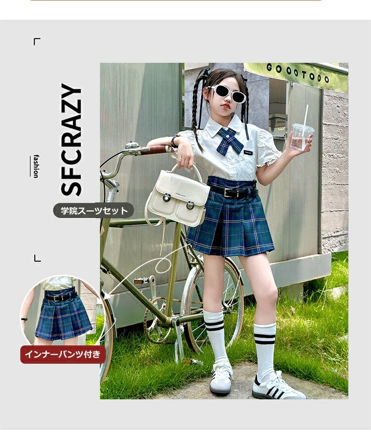 スカートセット 学院風 女の子 小学校 キッズ ドレス 続々入荷中 シャツ+リボン スカート+ベルト 4点セット 120 130 140 150 160 170