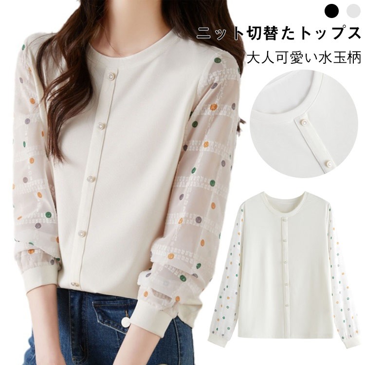 ドット柄 長袖シャツ ニットトップス 丸首 トップス ニット 切り替え 水玉 可愛い ゆったり 春物 20代 30代 春服