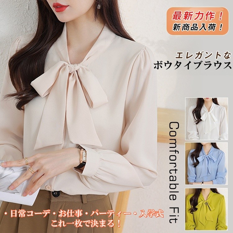 上品で華やかなボウタイリボンブラウス。フォーマルにもカジュアルにも大活躍、シーンを選ばずエレガントに決まる!