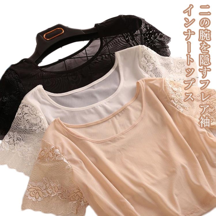 フリル袖 透け感 半袖 インナー 付け袖 ショート丈 Tシャツ 二の腕カバー 二の腕 冷房対策 薄手 重ね着 レース シアー 体型カバー クルーネック トップス 上品 細見え フリル ホワイト