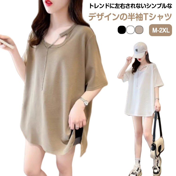 薄手 ビック M カットソー レディース 体型カバー ロング トップス チュニック ティーシャツ 半袖 シースルー 透け感 Tシャツ Uネック オーバーサイズ 無地 夏 シンプル インナー 春