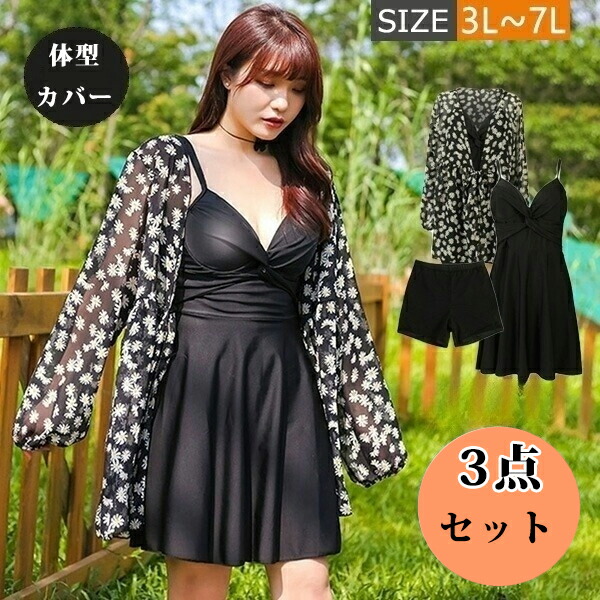 水着 レディース 大きいサイズ 3点セット タンキニ ラッシュガード 体型カバー ぽっちゃり ノンワイヤー パッド付 露出控えめ スポーティー 水陸両用 UVカット 3L 4L 6L 10代 2 5L