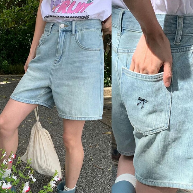 デニムワイド ハーフパンツ レディース リボン刺 春 夏 ハイウエスト Aライン ワイドレッグ ショートパンツ スーツパンツ 韓国ファッション カジュアル きれいめ ゆったり