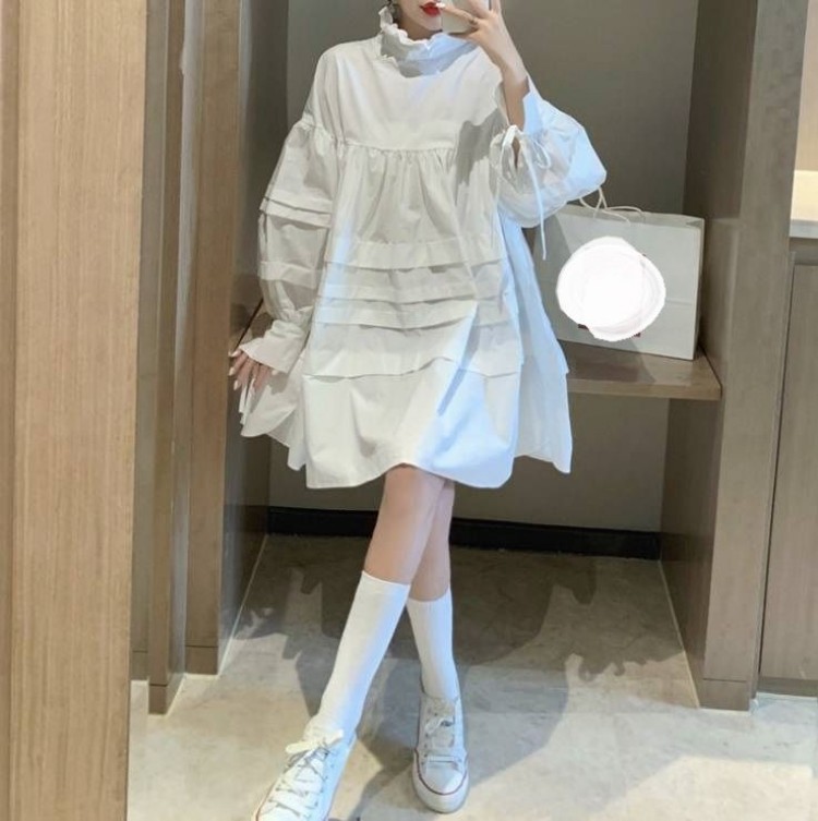 カバー デート 普段使い イベント フリルネック ゆったり ワンピース ホワイト レディース ファッション 10代 ボリューム袖 ガーリー ブラック フレア 20代 長袖 楽ちん シンプル ミニ丈