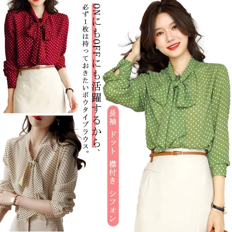 ドットブラウス 長袖 オフィス リボン バルーン袖 オフィス ボウタイ グリーン レッド フォーマル