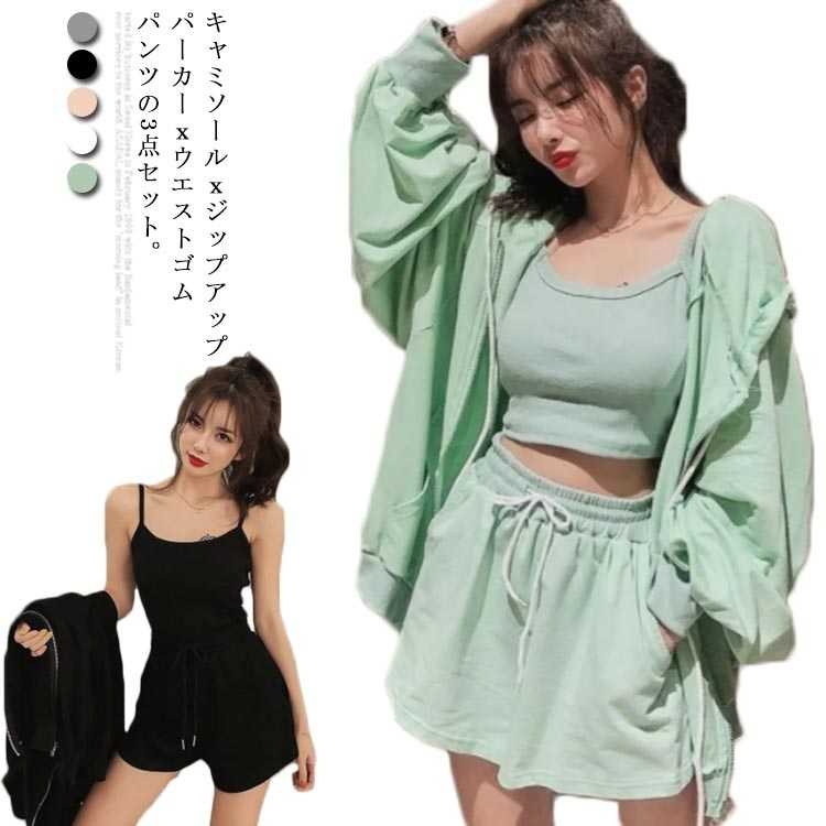 キャミソールxジップアップパーカーxウエストショートゴムパンツ 3点セット パーカー 上下セット スウェット スポーツ セクシー シンプル カジュアル きれいめ ユニーク