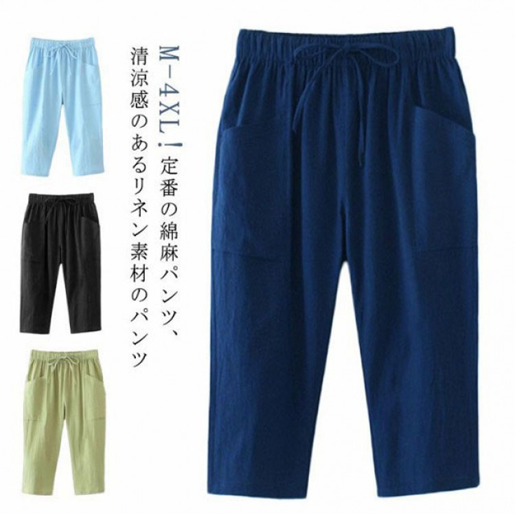 クロップトパンツ パンツ 春夏 綿麻 ボトムス サルエルパンツ ゆったり レディース 七分丈パンツ 夏 リネン リネンパンツ ゴム 体型カバー 美脚 涼しい 無地 部屋着 通気性 綿麻パ