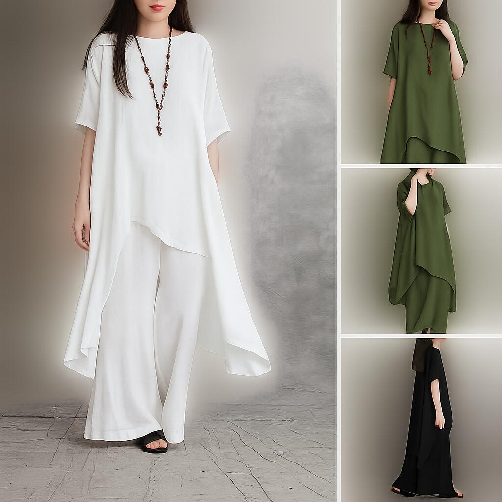 セットアップ レディース 夏 半袖 上下セット ワイドパンツ ロングパンツ 綿麻 春 カジュアル 柔らか きれいめ シンプル 軽量 ゆったり おしゃれ 体型カバー 透气 大きいサイズ 通勤