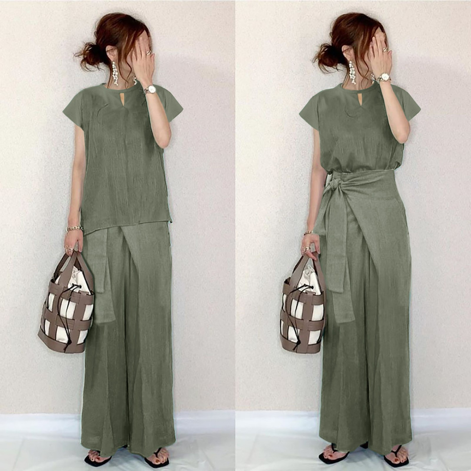 レディース セットアップ パンツスーツ 2点セット 上下セット Vネック 半袖 トップス アシンメトリー ドローストリング ロングパンツ 通勤 カジュアル 日系 2024新作 大人可愛い シンプ 春夏