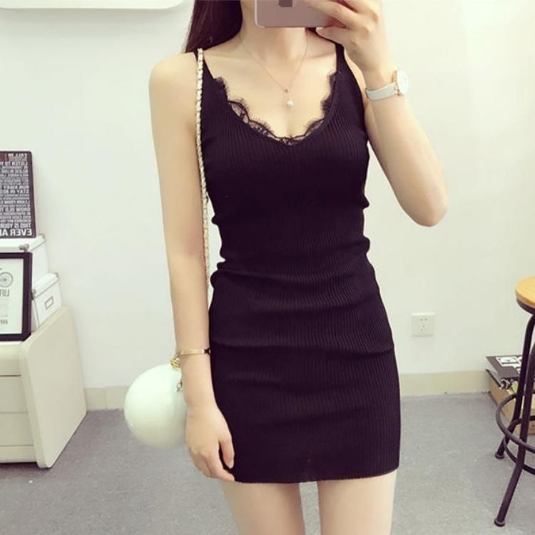 フリーサイズ タイト 夏 インナーワンピース 伸縮性 ニットキャミソール ノースリーブ 袖なし 無地 ロングキャミソール ストレッチ レース Vネック レディース 細身