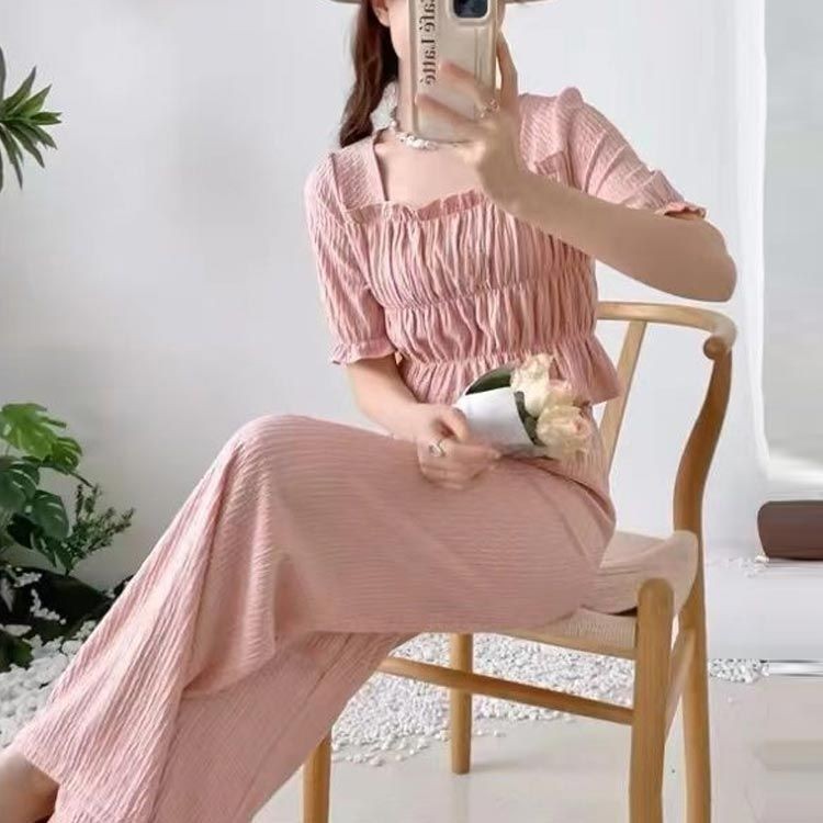 カジュアル 半袖 ブラウス フリル ウエストゴム ワイドパンツ