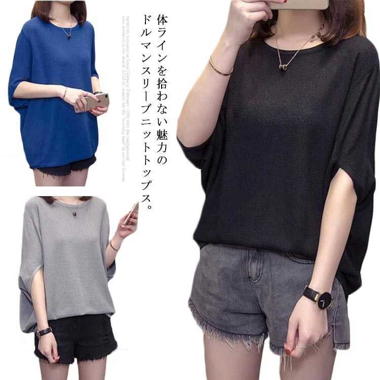 サマーニット ドルマンスリーブ 5分袖 シャリ感 レディース 大きいサイズ 体型カバー ニットセーター 春夏 薄手 Tシャツ カットソー トップス ゆるニット