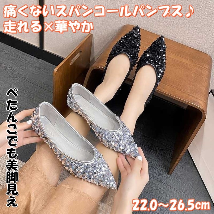 パンプス 痛くない 歩きやすい ローヒール フラットシューズ ポインテッドトゥ キラキラ 結婚式 走れる レディース 大きいサイズ 小さいサイズ バレエシューズ 28.0 22.0 スパンコール
