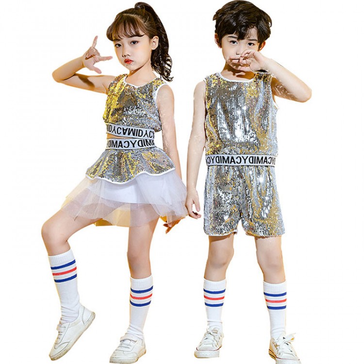スパンコール ジャズダンス衣装 キッズ ダンス衣装 セットアップ ダンス 衣装 ヒップホップ 男の子 ガールズ 可愛い チアダンス チアガール