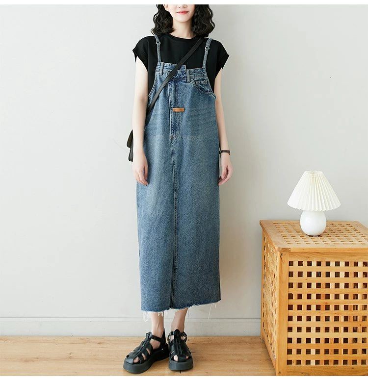 チュニック スポーティーな肩紐 キレイめ デニムジャンパースカート 学院風 夏 カジュアル デニム 無地 春 ジャンスカ スカート マキシ丈 ノースリーブワンピース サロペット