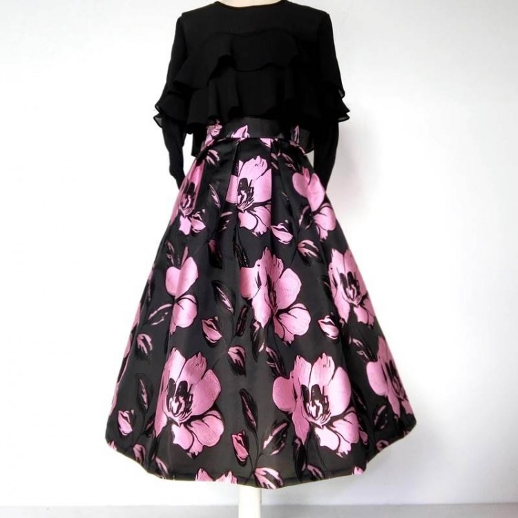 スカート ボトムス レディース フレア 膝下 フェミニン ハイウエスト ジャガード かわいい 大人可愛い 上品 おしゃれ レトロ