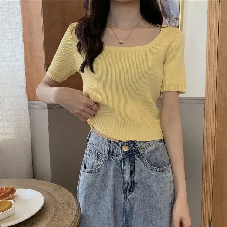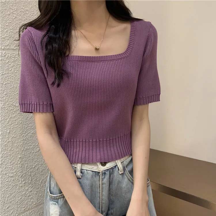 サマーニット レディース リブニット トップス Tシャツ カットソー 人気 ホワイト(角首) ブラック(角首) パープル(角首) グリーン(角首) レッド(角首) イエロー(角首) ホワイト(ラウンドネック) ブラック(ラウンドネック) パープル(ラウンドネック) グリーン(ラウンドネック) レッド(ラウンドネック) イエロー(ラウンドネック) S M L XL