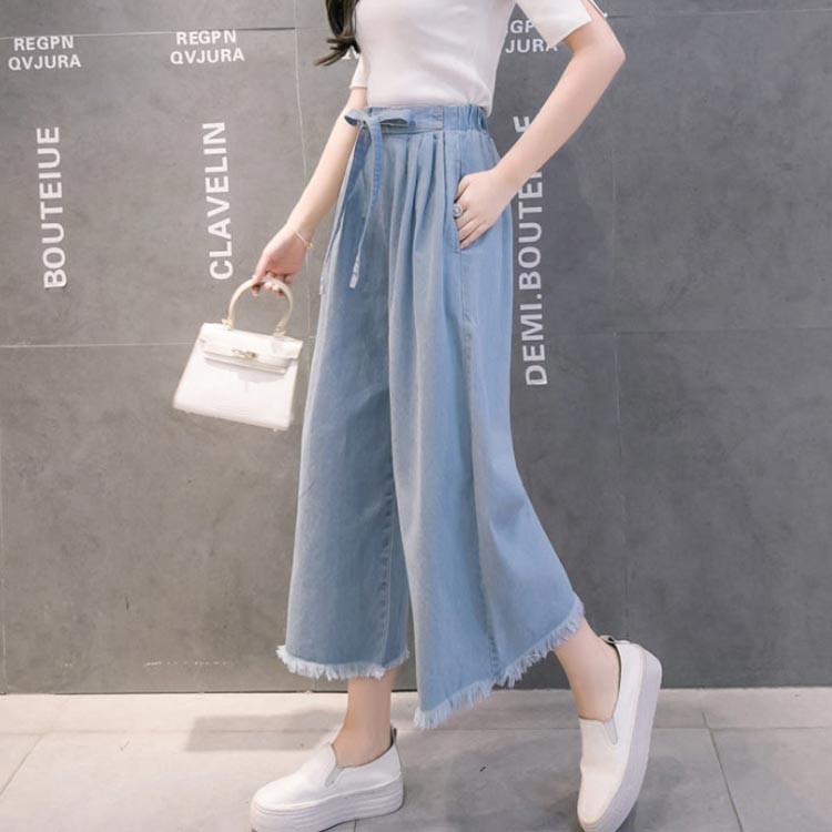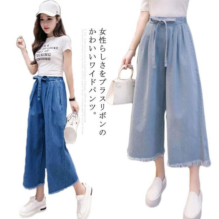 デニムワイドパンツ レディース 九分丈 ライトブルー ダークブルー S M L XL