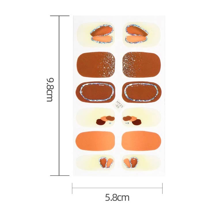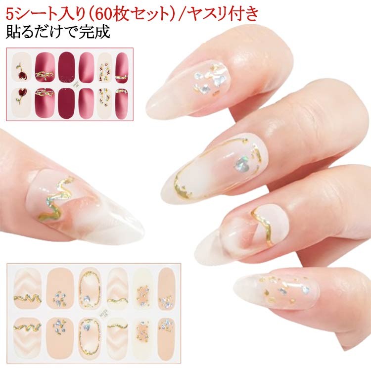 5シート入り(60枚セット)【ご使用前に】●爪に油分や水分、汚れが付着しているとシールが剥がれやすくなりますので、爪の表面をキレイに拭き取ってください。●甘皮を処理し、付属のファイルなどで爪の形や表面を整えるとよりキレイに仕上がります。●シートからネイルシールを剥がす際にはシートの外側部分を持って剥がしてください。(1)製品を爪に合わせ、爪よりも少し小さめのネイルシールをお選びください。(2)キューティクルラインと1mmほどの余裕があるところにネイルシールを貼ってください。(3)ネイルシールを貼って余りのシールは爪の形に合わせて折ってください。ファイルを利用して、爪の下の方向に向けて余りのネイルシールを削ってください。(4)お好みの硬化方法を選んでください。・寝る前に貼り硬化する場合・自然光で硬化する場合:約2時間(自然光が多い室内と室外にて)・UV&LEDライトで硬化する場合:約30秒【剥がし方】●ウッドスティックでキューティクルラインからゆっくり押出しながら剥がしてください。