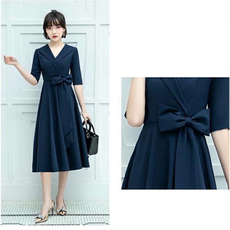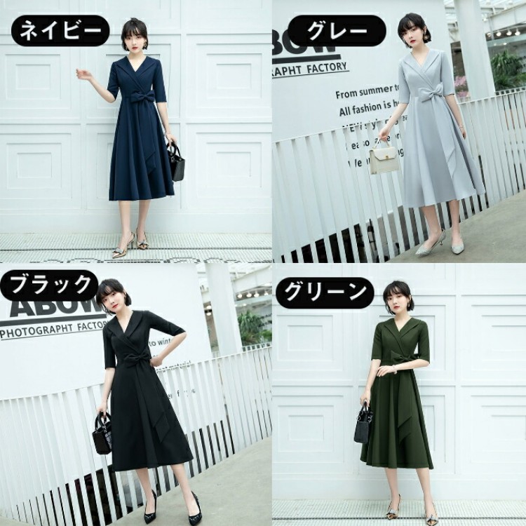 ワンピース レディース 中袖 Aライン 無地 膝下丈 細見え 着痩せ 体型カバー 夏 春秋 シンプル 女性 xS-3XL ロング エレガント ドレス