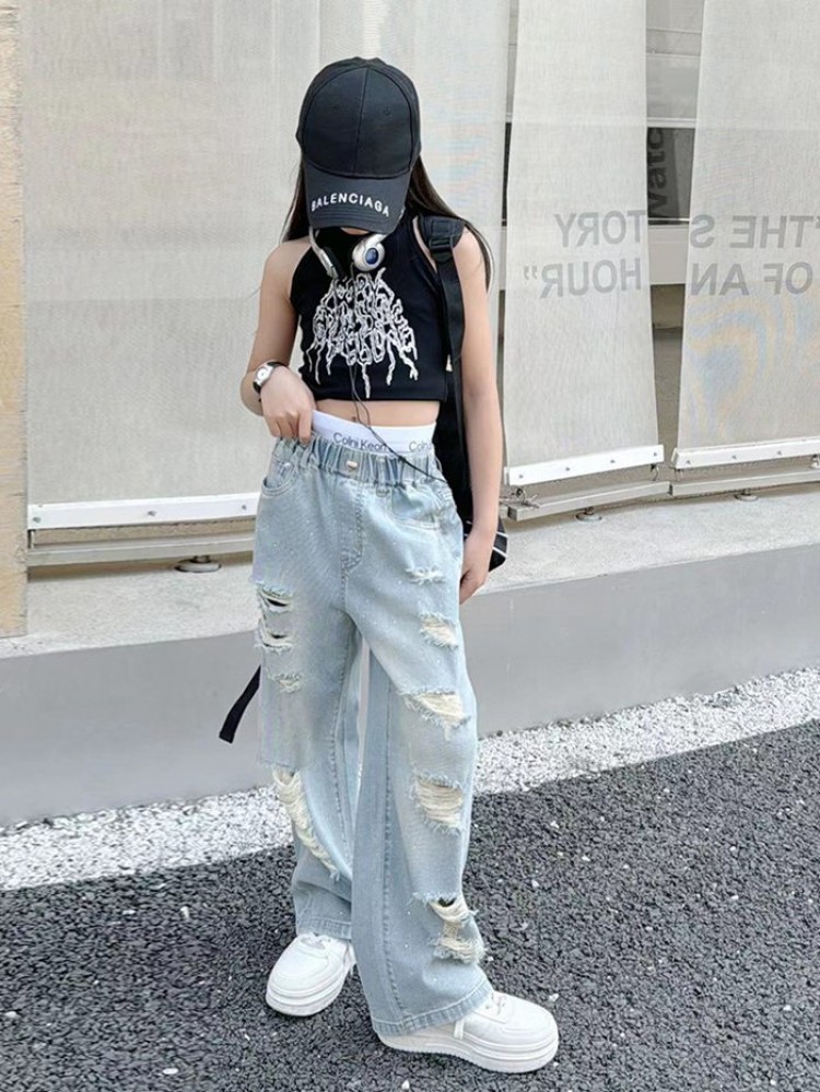 人気商品 春 夏 秋 新作 子供服 おしゃれ 女の子 デニム ダメージ ジーンズ キッズ ダンス衣装 ジュニア カジュアルパンツ