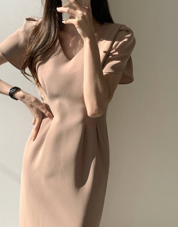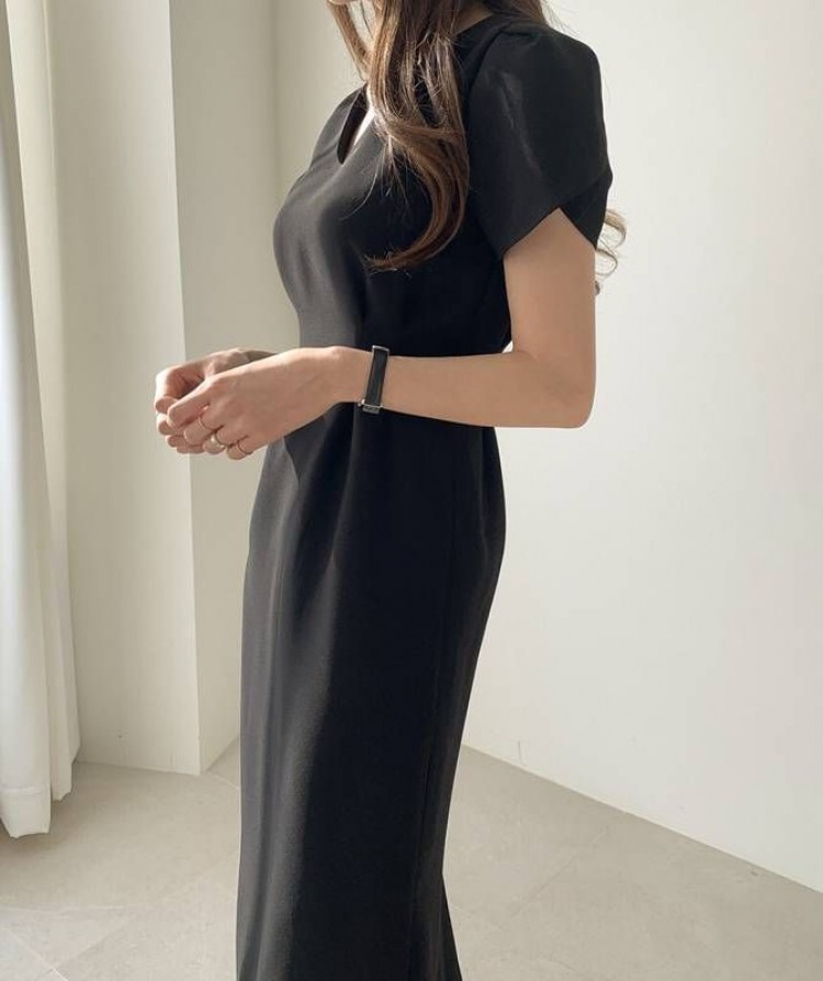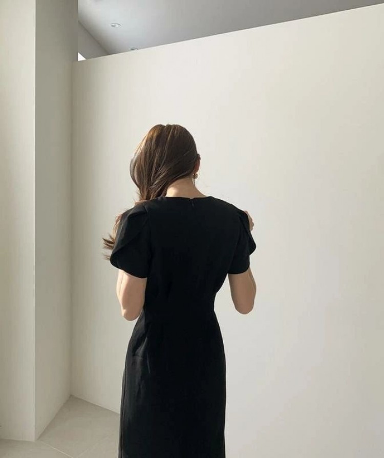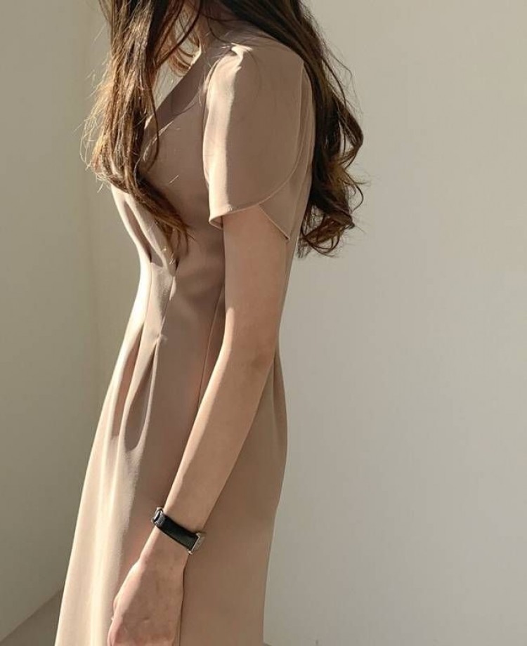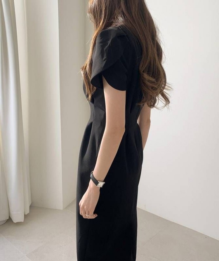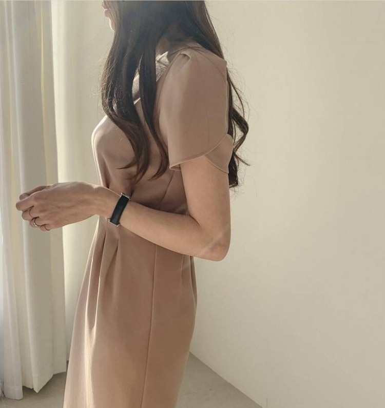 2色展開 エレガント ミモレ 半袖 S ワンピース 続々登場 べージュ ブラック S M L