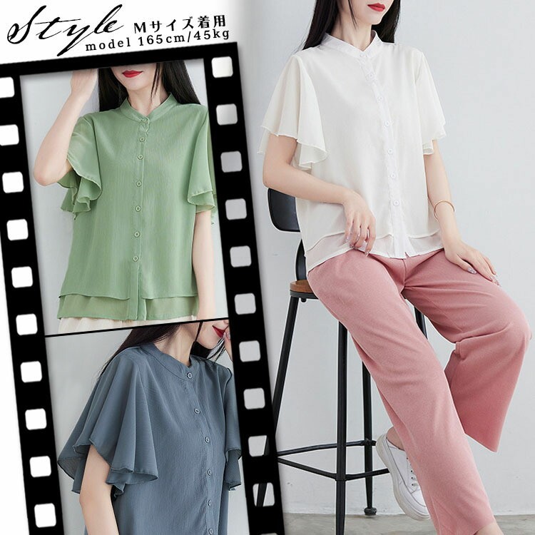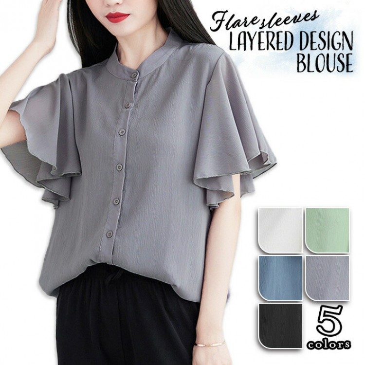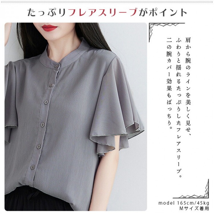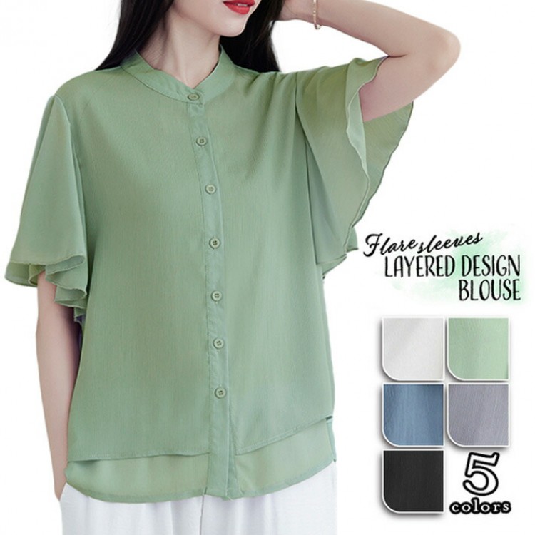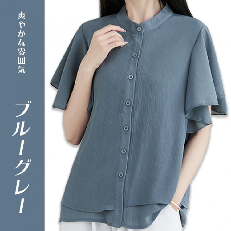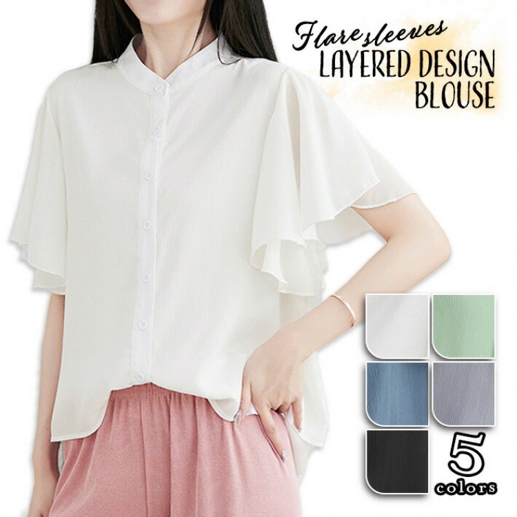 【メール便で送料無料】【レビューを書いて10%OFFクーポンGET】涼し気 薄手 楊柳シフォン フレアスリーブ &レイヤード デザイン スタンドカラー 半袖ブラウス シフォンブラウス 楊柳ブラウス シャツブラウス フリル袖 涼しい 五分袖 春夏 夏 夏用 大人 30代 40代 レディース