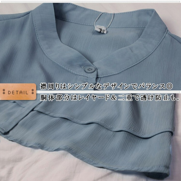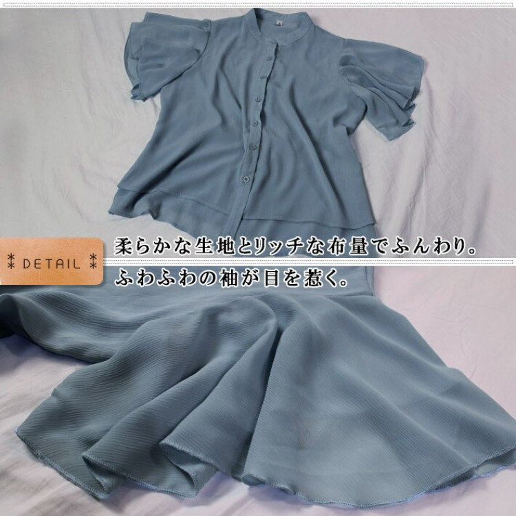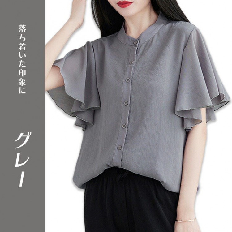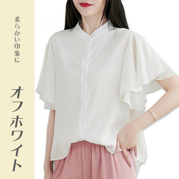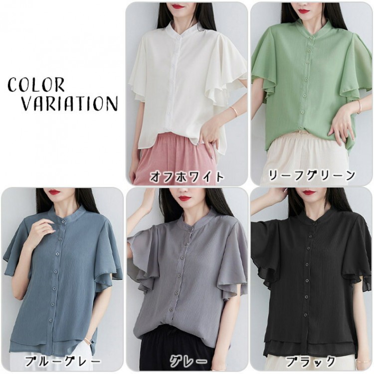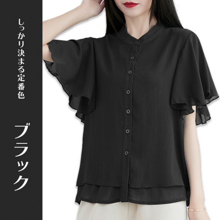 【メール便で送料無料】【レビューを書いて10%OFFクーポンGET】涼し気 薄手 楊柳シフォン フレアスリーブ &レイヤード デザイン スタンドカラー 半袖ブラウス シフォンブラウス 楊柳ブラウス シャツブラウス フリル袖 涼しい 五分袖 春夏 夏 夏用 大人 30代 40代 レディース