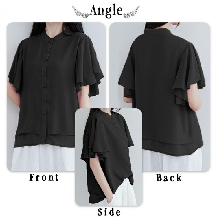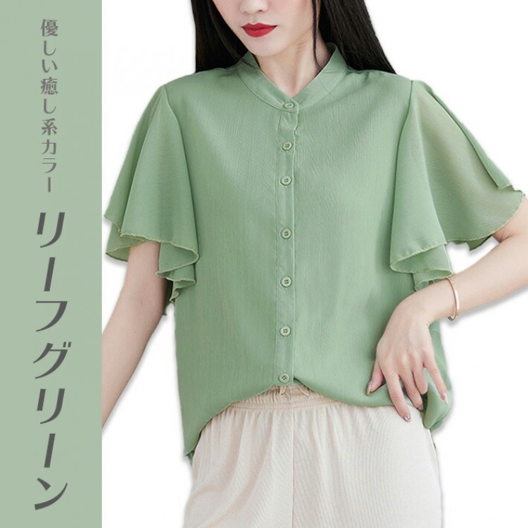 涼し気 薄手 楊柳シフォン フレアスリーブ &レイヤード デザイン スタンドカラー 半袖ブラウス シフォンブラウス 楊柳ブラウス シャツブラウス フリル袖 春夏 五分袖 涼しい 夏用