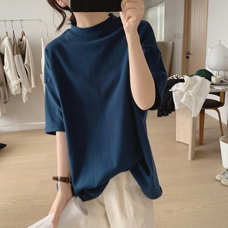 ハイネック Tシャツ レディース 夏 トップス Tシャツ カットソー 通販 黒 白 ネイビー グレーブルー M L XL 2XL