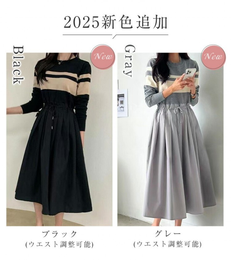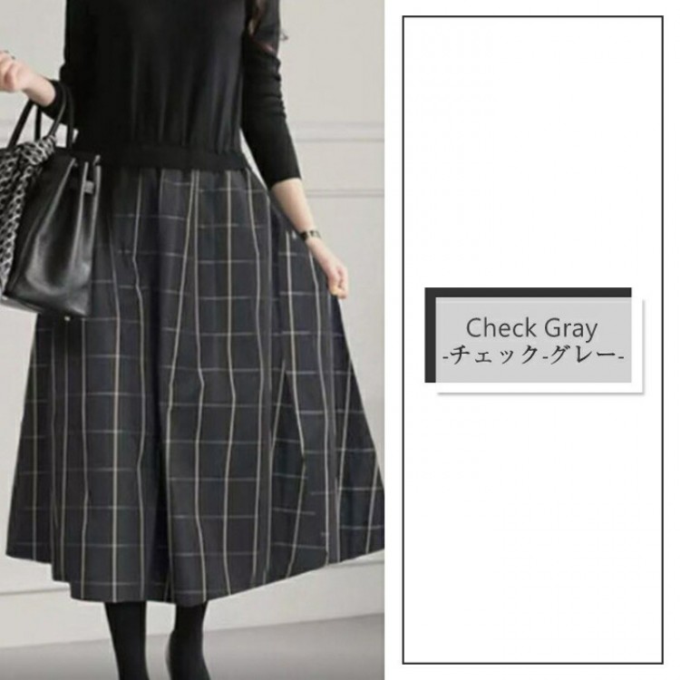 ワンピース きれいめ 秋冬 ロング 春 無地-黒 チェック-グレー (new)ブラック+ベージュ (new)ベージュ (new)チェックー黒 (new)ブラック 【新色】ブラック(ウエスト調整可) 【新色】グレー(ウエスト調整可)